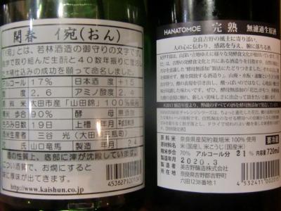 花巴完熟とともに、島根県大田市温泉津の若林酒造の同じくきもと培養酵母無添加の開春「おん」を試してみた。木桶造り精米歩合90%と稀なレシピなだけに独創的な強い味わいで淡麗と対極な呑み応えだ。