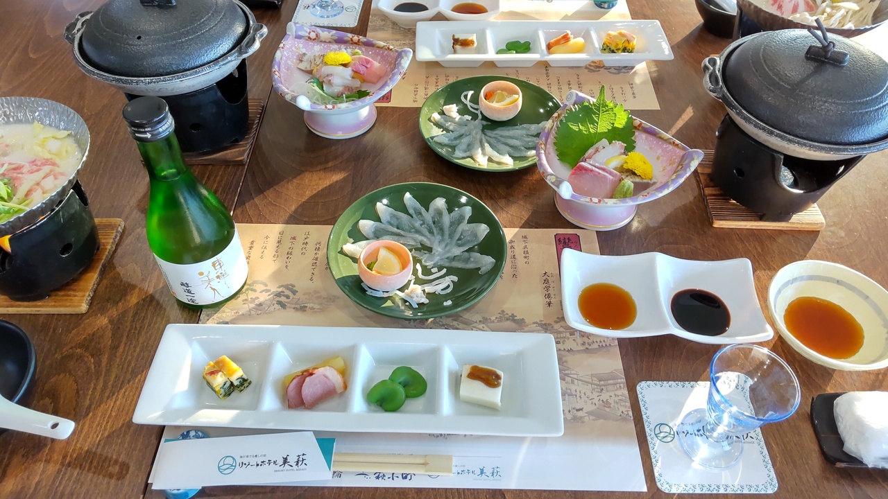 菊ヶ浜越しに指月山や萩6島を望むレストランは秀逸で、指月山に沈む夕日のダイナミックな景勝を夕食と共に味わう事もできる。量を絞ってふぐ刺しと見蘭牛のしゃぶしゃぶをどちらも食せるなど料理内容に工夫されていて良心的。