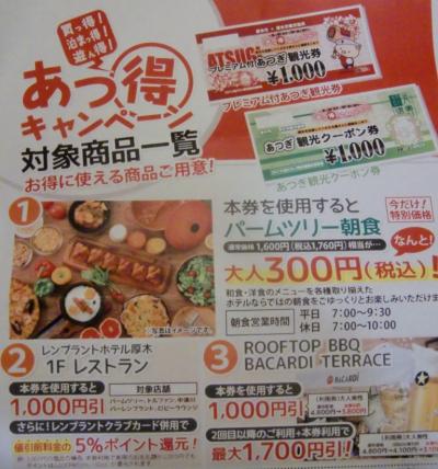 厚木市のあつ得キャンペーンを実施中で市内のみ限定有効の金券のプレゼントなどの優遇を受けられる。