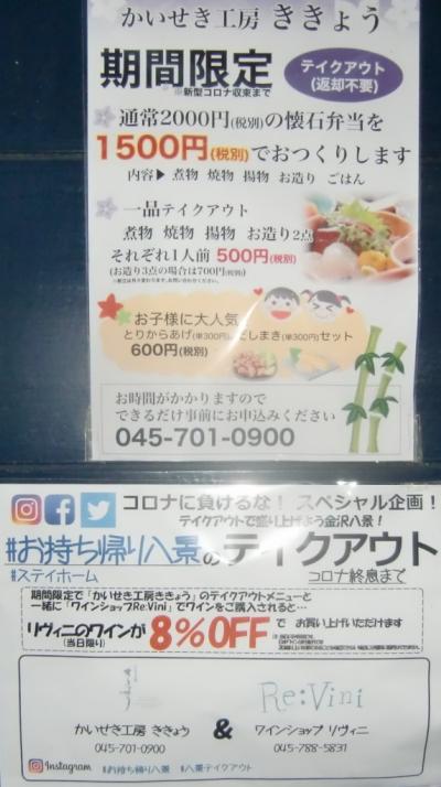 横浜市金沢区の京急金沢八景駅近く、平潟湾プロムナードを進んだ道の反対側にある。コロナ禍が続くなかテイクアウトへ注力している。店内はランチタイムのみの営業で夜の部は休止中だが、懐石弁当を25%引きの設定で配達している。もともと法事慶事に対応していて、配達は得意なのだろう。