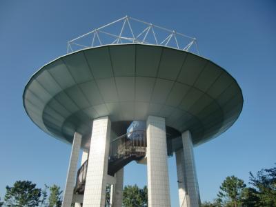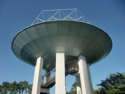神奈川県横浜市の海岸線最南部にある野島の山頂にある標高57mの展望台で、円盤型の展望デッキの上にトラス構造がある凝った意匠である。