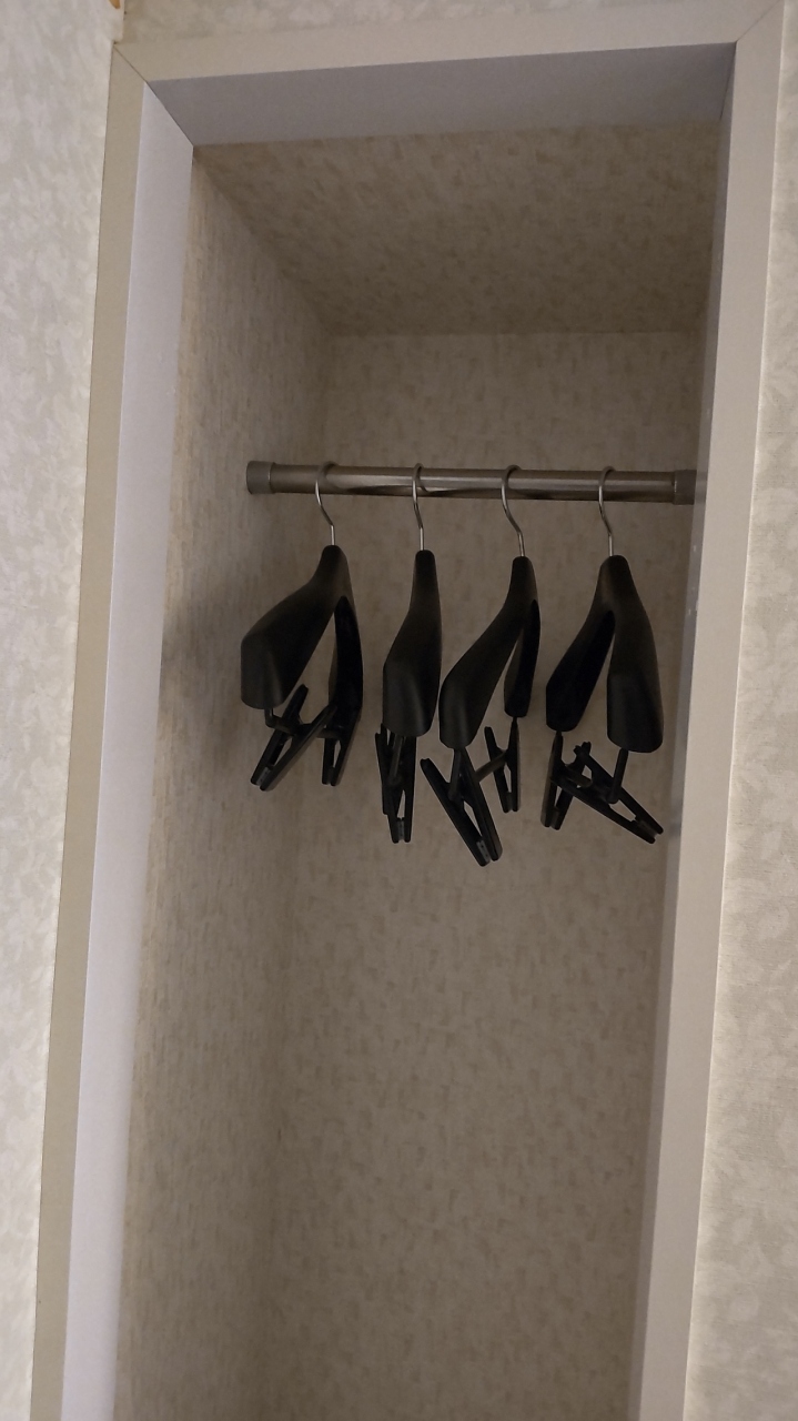 厚手の着用の時期の到来、入口近くのクローゼットは重宝だ。クリップ付のハンガーも有り難い。