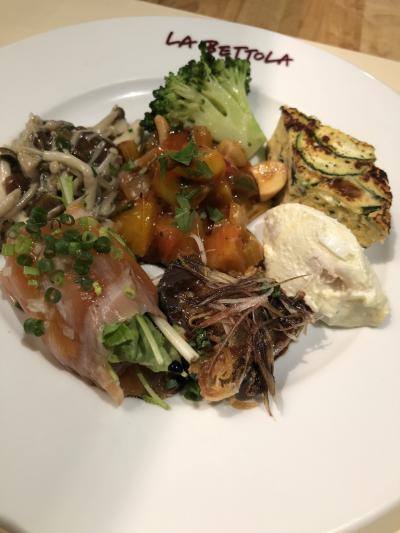 税込2200円のコースは前菜とパスタ。税込3300円のコースは前菜、パスタ、メイン。メインのあるコースにして、前菜の盛り合わせ、トマトパスタ、秀味豚のローストにしました。