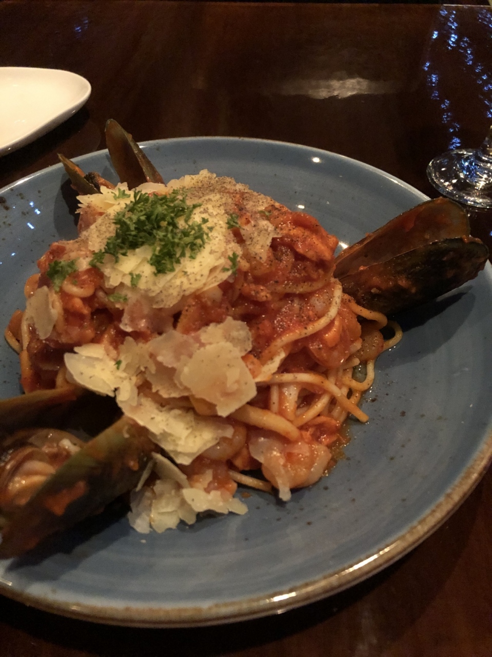 地元の人で賑わってます。私は、白ワインとスパゲティマリナーラを頼みました。