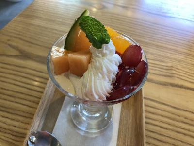 一番小さいパフェは、3種類のフルーツが入ります。清光オレンジとメロンと種無しブドウでした。ヨーグルトだから酸っぱいかなと思ったけど、フルーツは甘ーいし、スッキリしていて、また食べに行きたいと思いました。