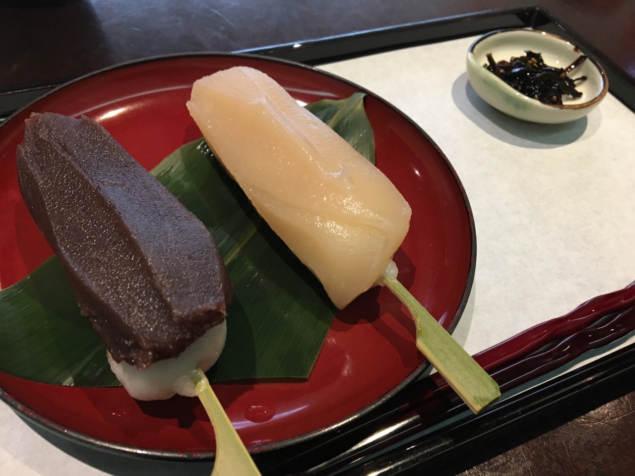 私は、お団子二つセットのものを注文します。普通のお餅にこしあんを付けたものと、こした白あんを付けたもの。