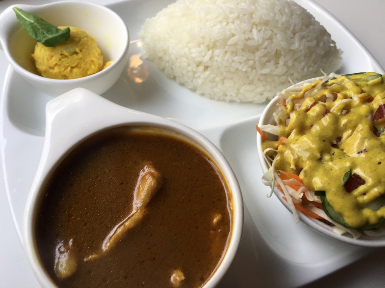 ポテトサラダとサラダとカレーがついたセット。ちなみにカレーは、いくつかの種類から選択できるので、私はチキンにしました。