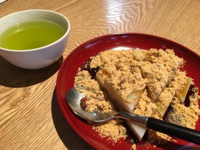 もっとも有名であろう、くずもちをいただきます。きなこと黒蜜がかかっていて、緑茶と一緒に食べました。