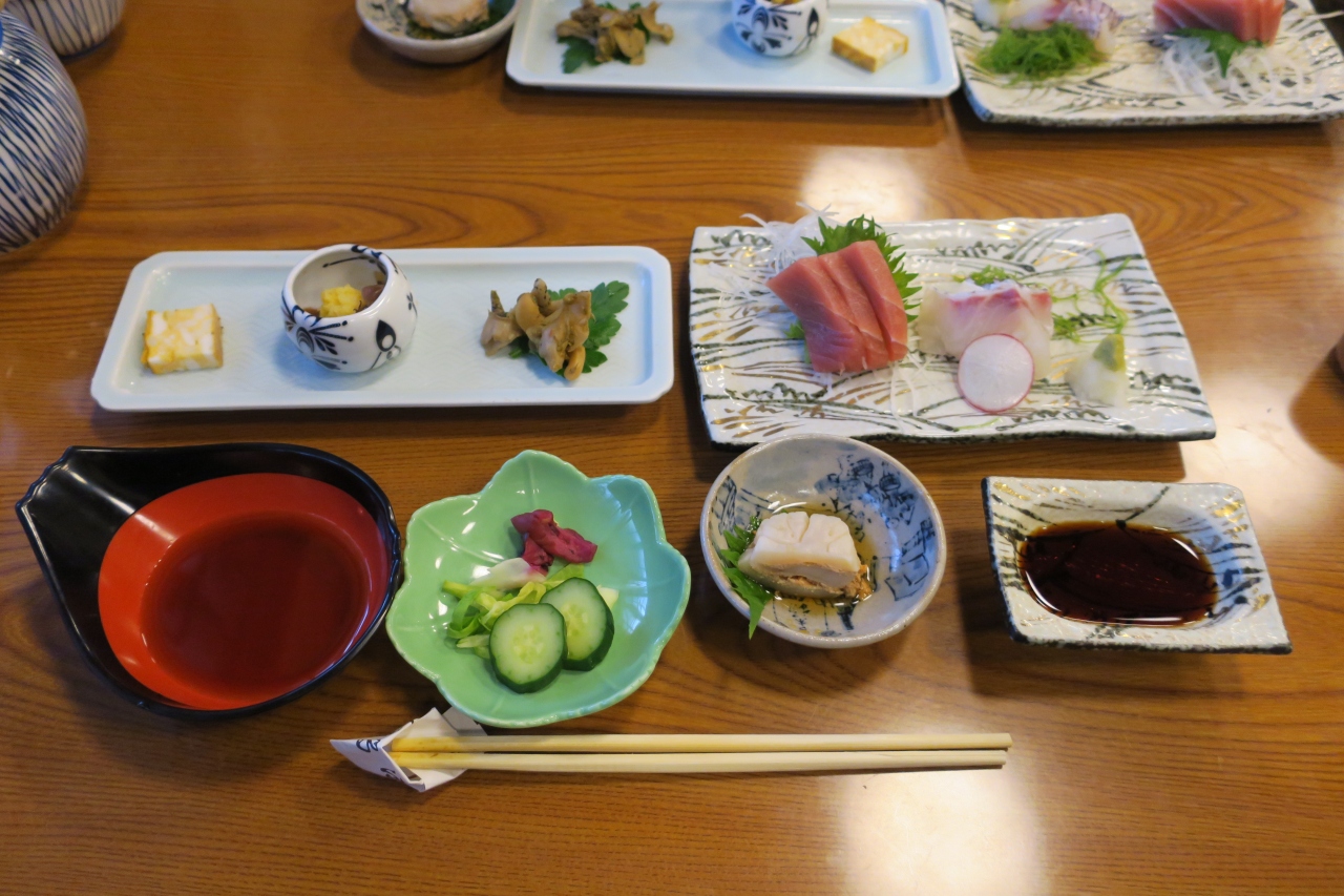 長蛇の列をまち、テーブル席へ。満席とはこのことである。メニューを見て、コース料理を注文。刺身、てんぷらなどお昼としては、ちょうどよい。元網元であることから、魚料理中心である。もちろんお寿司もあり、太巻きも特徴のあるだるまがある。今日は持ち帰りできないので、帰りに挑戦することにした。
