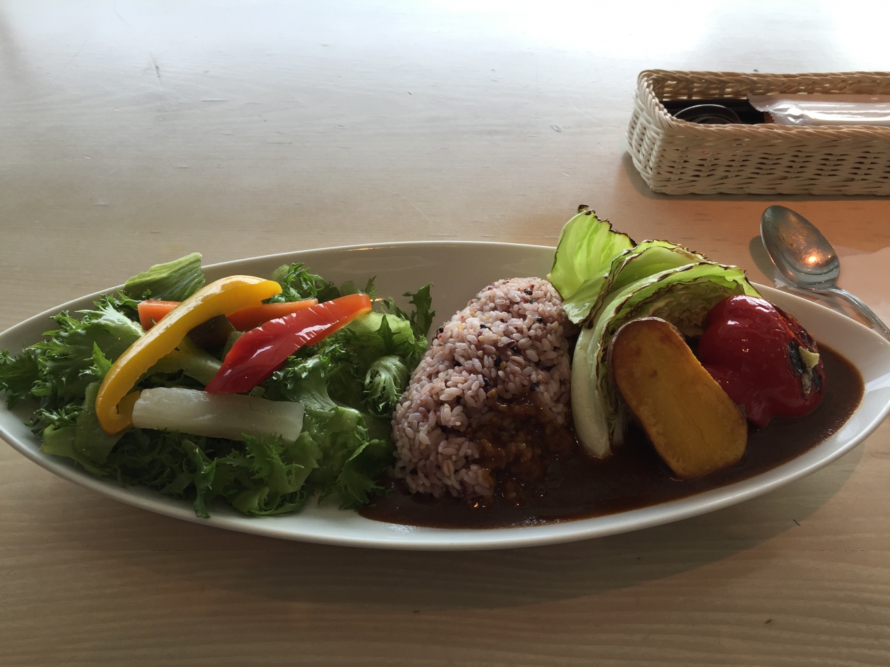 ランドマーク近くに行ったので、タワーの5階にあるchef's Vでサラメシを。見晴らしの良いところにあり、ゆっくりと食事ができるのでよいところです。目の前には、帆船日本丸ががっつり見えており、これも食欲増進です。今日は、野菜たっぷりの農園カレーで、おなかを満たしました。