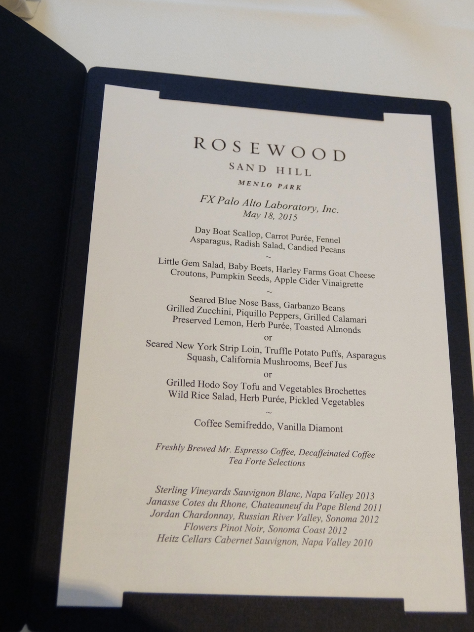 会社設立20周年を祝うべく、Rosewood Sandhill Hotelの中の個室を借り切り、食事をサーブしてもらった。ワインもしっかり選べ、食がすばらしく進むと同時に話も今まで以上に盛り上がった。やはり、おいしいワインと食は、すべてを盛り上げてくれた。