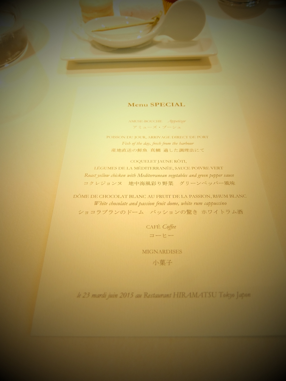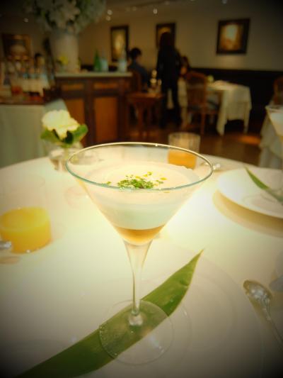 ヒラマツは、フランス料理の老舗の一つである。ここ広尾は、地下鉄の駅を降りて、有栖川公園の方に向かい徒歩1分と大変近い。中に入ると、一階は、広い待合場所になっている。3階がレストランである。フランス料理は、割合あっさりしており、ライトな感じであった。