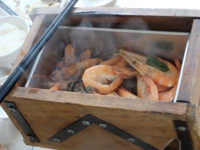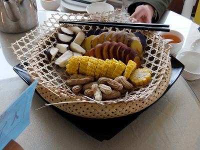 お昼は、この地方の郷土料理を、九戸茶語でいただく。窓からの景色は晴れていれば最高であるが、この日は小雨模様で視界が厳しい。崖っぷちに建つ建物であり、何かあれば、厳しい状況であろう。お昼としては軽めであった。