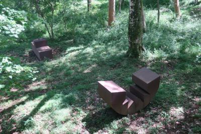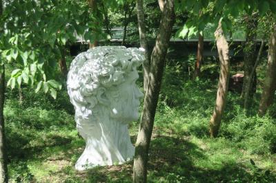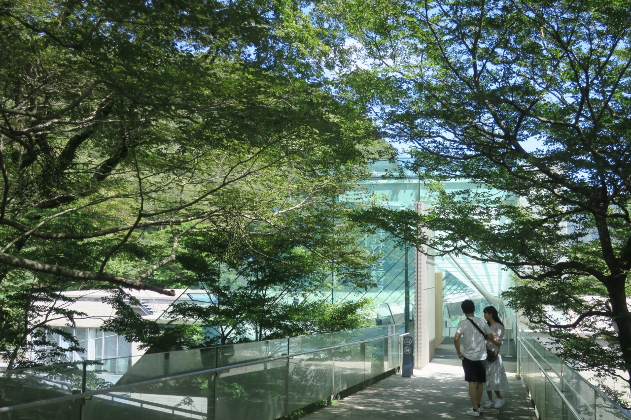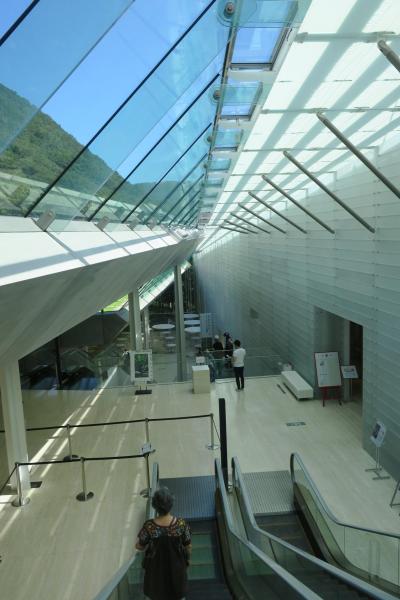 山の斜面に建てられたこの美術館は、森に包まれ景色を邪魔しないようになっている。大変な心遣いである。道路からも美術館そのものは見えないようになっている。その道路から橋を渡って、最上階の入り口につながっている。橋の両側にはいくつかの彫刻が置かれており、風情がある。中はすべてエスカレーターで、下り、受付、地下1階、2階の展示室である。1階は受け付け、地下1階にはミュージアル、展示室となっている。写メに作ってあることから、空間が素晴らしいし、天井がガラス張りということもあり、とても贅沢である。