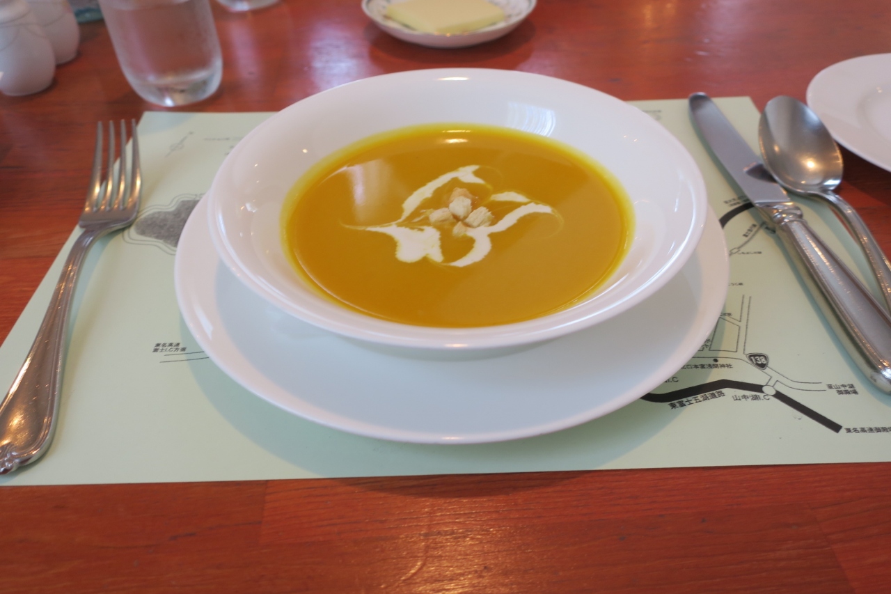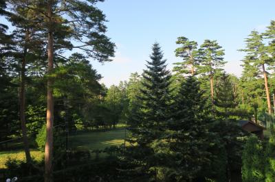 アカマツに囲まれた林の中にある静かな場所のホテルです。林に囲まれているので、富士山などは見えませんが、落ち着いたところにあります。チェックインして、夕食の時間を確認し、それまでの間にひと風呂を浴びて、疲れを癒した。夕食は、ラウンジで。