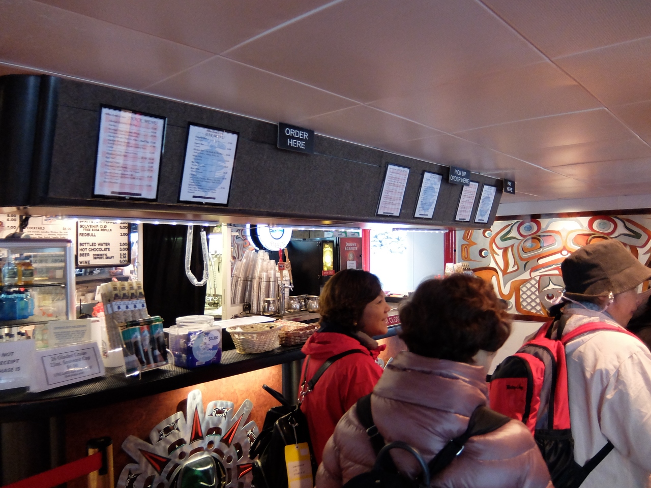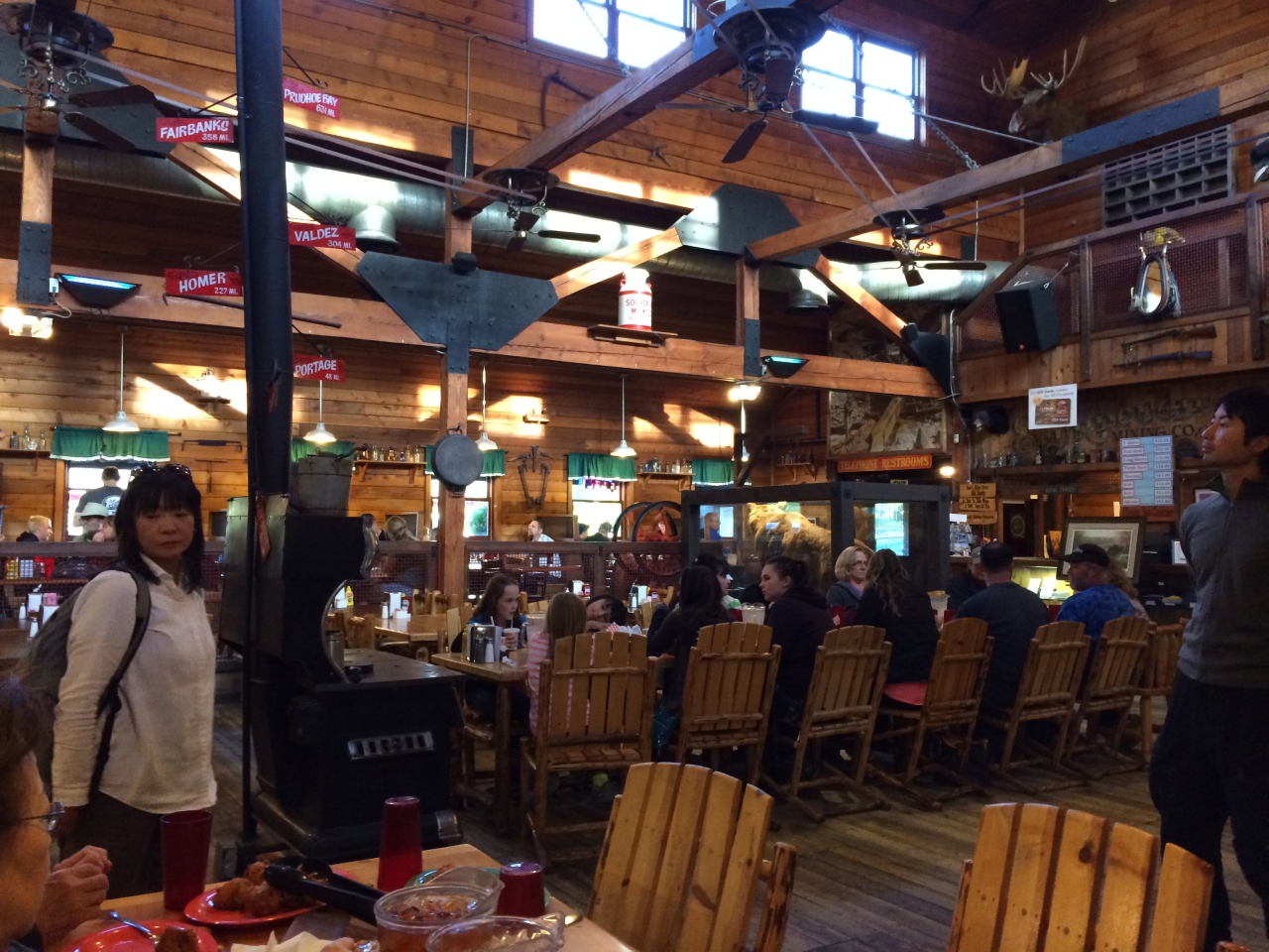 クルーズ船からの帰り道で、このレストランへ。開拓時代の名残もあるレストランである。いろいろたくさんの品数が出て、皆さんおなか一杯となりました。日本的に言えば、B級グルメであり、サラダはコルスロー、トウモロコシの揚げたもの、トナカイのソーセージ、ビーフ、Cod(たら)などなど。もちろんビールはピッチャーで。デザートは、ソフトクリームの機械で、自由にトッピングをかけられるということで、女性軍は大喜び。