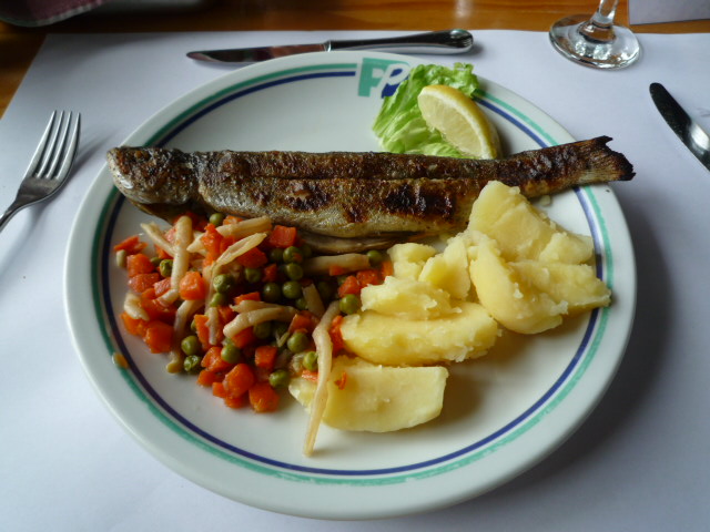 プリトヴィッツェ湖群国立公園を午前中に散策し、身も心もすがすがしくなって大変おなかがすきました。帰りは、途中からバスで、ゲートまで来ました。そこから歩いて4~5分のところにあるレストランです。湖では、ウグイ、マスなどが、濁りのない湖で、沢山泳いでいました。ひょとするとこれが食べられるのかなと思いましたが、国立公園では不可能です。飲み物を注文し、それからサラダ、そしてウグイのメインディッシュです。やっと油濃いものから久しぶりで淡白な料理に到達できました。