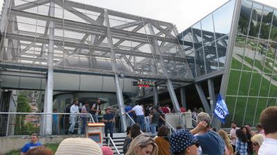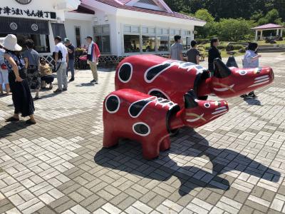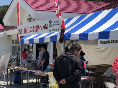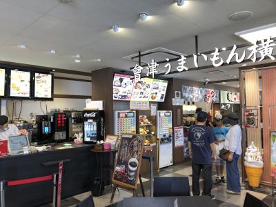 郡山を経って、1時間ちょいのところにあり、トイレ休憩や、食事、お土産など購入に便利である。丁度入り口では、夏休みもあり、会津の宣伝を兼ね、いろいろなパンフレットを配布していた。もちろん会津名物の赤べこもあり、子供たちが首を揺らしていた。