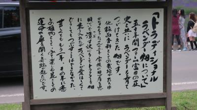 ラベンダーの観光で、国内はもとより海外からのお客様で超満員。蓮爆できず。市内から10数分のところの古代会丘の中腹にある。眺望は良さそう。でも今日はどんよりした雲で、その願いが叶わぬ。ホテルの窓から気球体験用の気球が見えた。あらかじめ予約しておいたメインダイニングで、夕食をとる。地産地消の食材で大変おいしかった。酔いがさめてから、ホテル隣接の紫彩の湯へ。温泉が素晴らしかった。