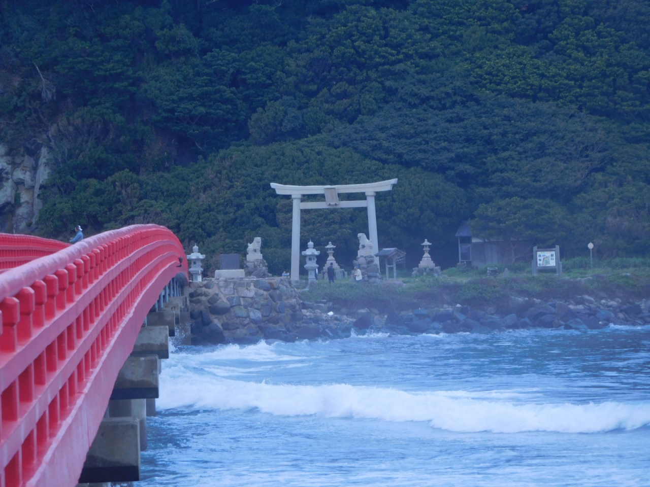 行ってみると 赤い橋の先に小島があり、大湊神社の鳥居が見えました。