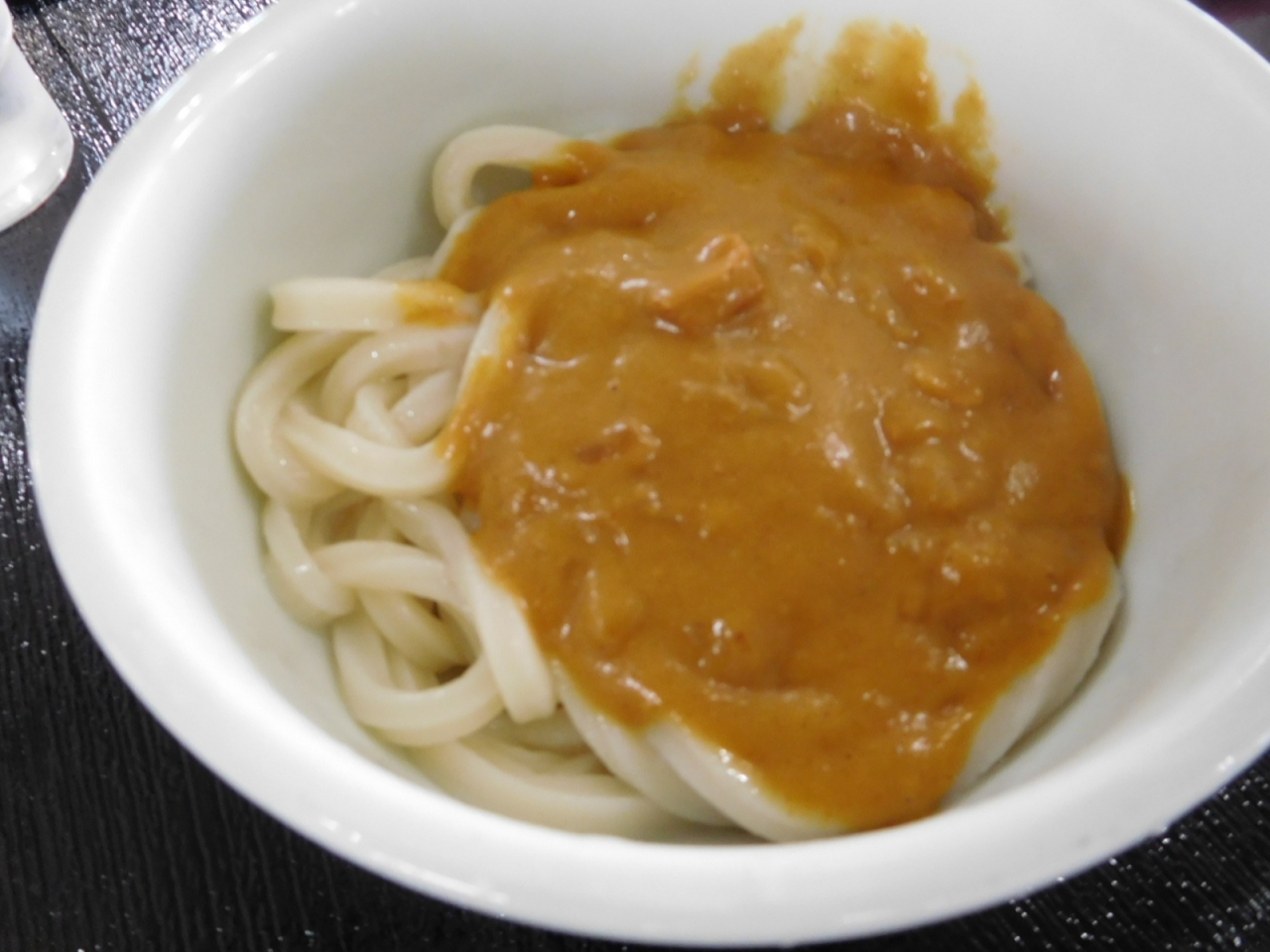 常連さんの要望でカレーうどんもやっています 少し甘めの汁には七味がぴったりです。