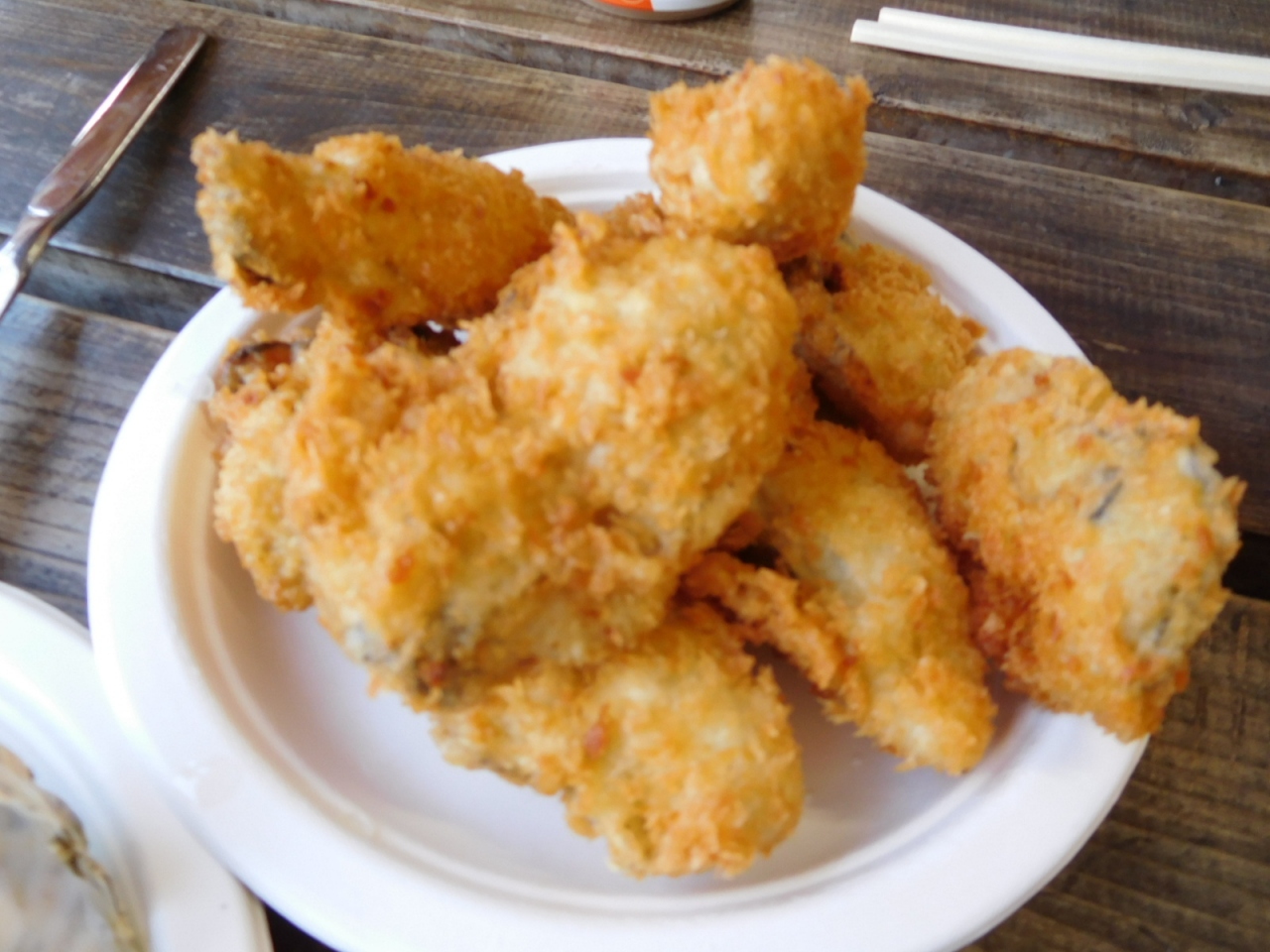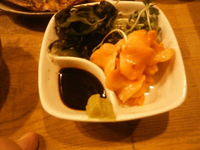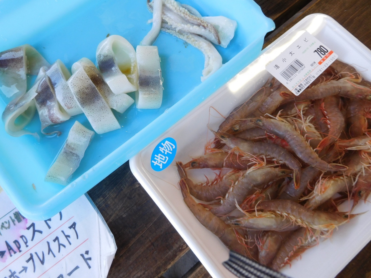 建物の中の魚屋で、するめいかを焼けるようにさばいてもらって350円、生きている 小エビが30匹ぐらい入って 780円でした。 カキフライも旨かった。