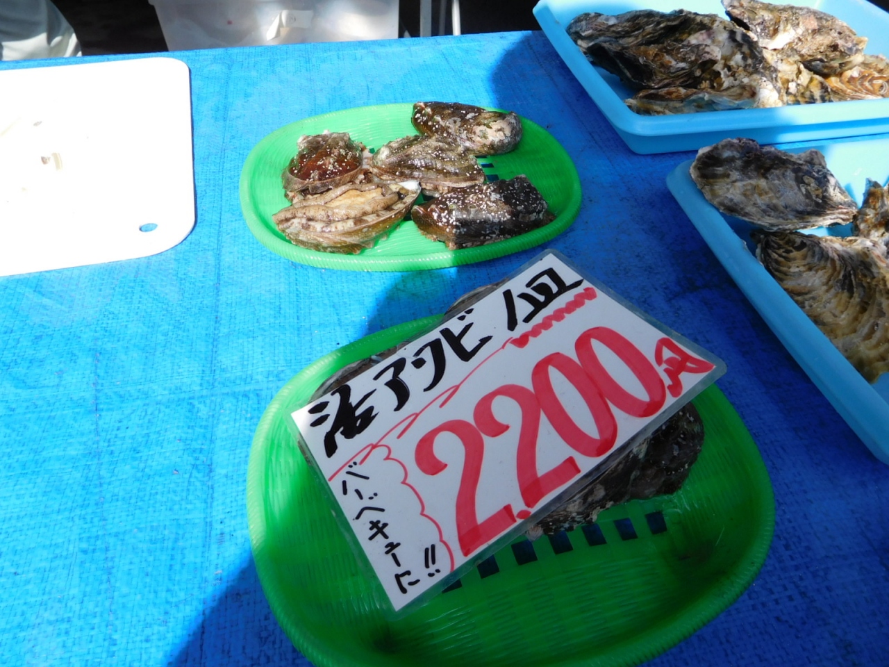 殻付きの牡蠣が今年は1キロ1000円 ホタテガイ、ハマグリ、大アサリなどが 一個4~500円です。