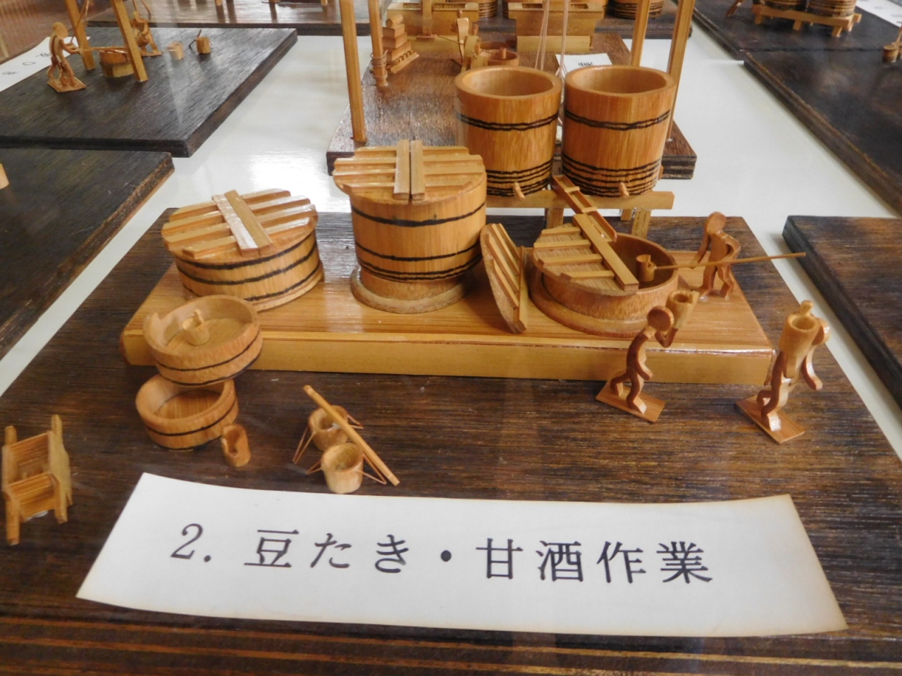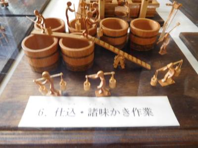 醤油造りの工程を表わした木の人形と、昔使われていた器具が保存されています。