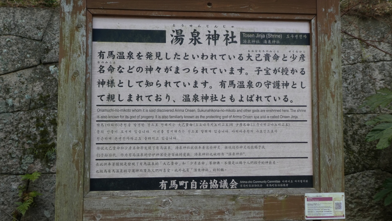 有馬を最初に発見したと言われる大己貴命(おおなむちのみこと、大国主命)、少彦名命(すくなひこなのみこと)、熊野久須美命(くまのくすみのみこと)が祀られており 子授け神社とも言われています。