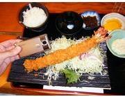 皿からはみ出すジャンボとんかつ(でも薄い)や厚切りとんかつ これはボリュームたっぷり、そして30cmを越えるジャンボエビフライ は壮観です。