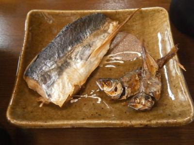 地元産のモズク、鯖の煮付け、トビウオと豆鯵の干物、そして小イカときびなごとモズクの天ぷらにご飯とみそ汁がベースで、それにとれたての生きている魚の活け造りがこれでもかとでてきました。