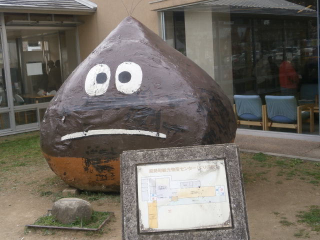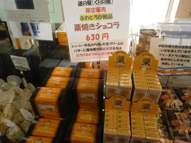 入り口には1mもあるような栗のユルキャラ 栗ぼうがむかえてくれ、焼餅やソフトクリームの屋台も出ています、そしてそう産物だけでなく物産館には木材加工品やこの地の特産菊炭も売っています。