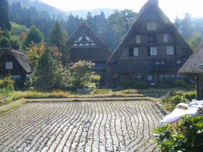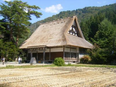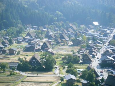 かやぶきの屋根の家はあちこちにありますが この地の家は3階建てほど大きなかやぶきの家です、そしてそれが皆同じ方向を見ているのは雪深い土地なので雪に合わせて家を出る向きが決まっているからなんですね。- 旅行時期