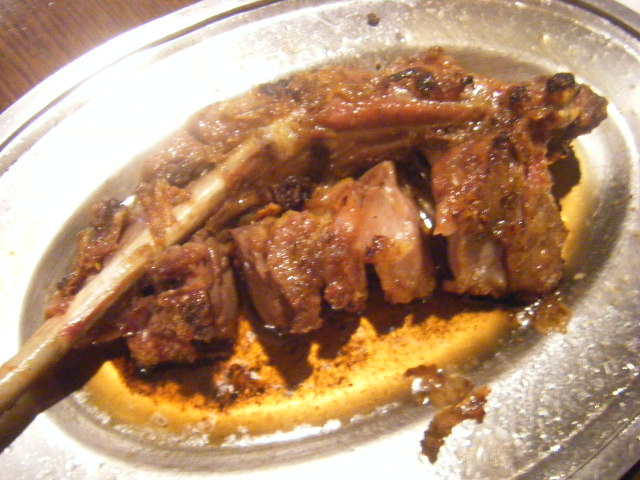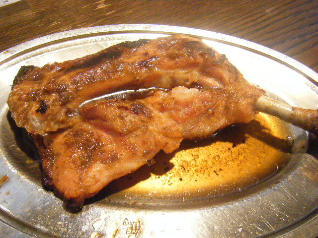 香辛料とニンニクを効かせたスパイシーな鶏の骨付きのモモ肉、親鳥は地鳥そのままの堅さです これをかみしめてビールを呑むのが最高です。