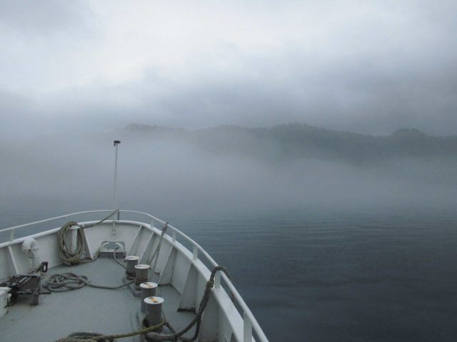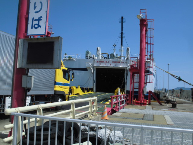 普通のフェリーのように 車の搭乗口から 滑り止めの為 ガタガタの船底を階段まで、そこから細く急な階段を3階まで上ってデッキに出てからでないと、船室には入れません。