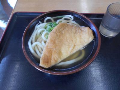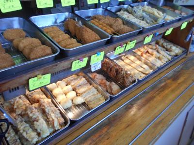 分厚いきつねうどん用の揚げと、一本揚げの竹輪の天ぷらのある店、トッピングには 天かす、つけもの、ラッキョウまでありました。
