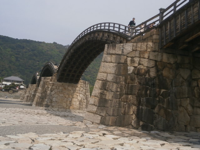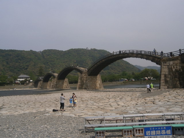浅くきれいな錦川に架かった橋です、木造の太鼓橋と思っていましたが 段の高さが低く抑えられているので、お年寄りでも楽に渡れます。