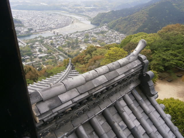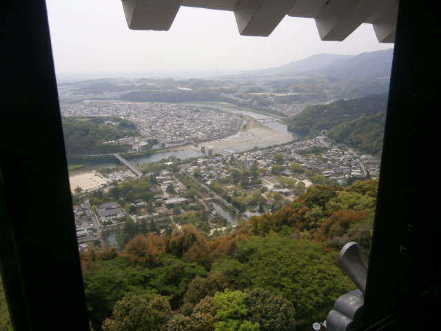 天守閣からはまがって流れる錦川とそこにかかる錦帯橋や城下町が一望できます。