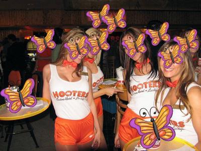 HOOTERSって全米にあるレストランですよね。今回シカゴのオヘア空港近くのHOOTERSへ行きました。平日夜でもかなり込んでましたが、食べるものはハンバーガーとバッファローウイングくらいかな。味は普通。値段は普通。HardrockCafeの方が上か?お目当ては、ウエートレスのユニフォーム(チアリーダーがテーマらしい)でしたが、ここのお店はその点からはお勧めできないキャストぞろいでした。写真はネットで拾ったものです。こんな人達がいればもっと良かったのですが・・・・。