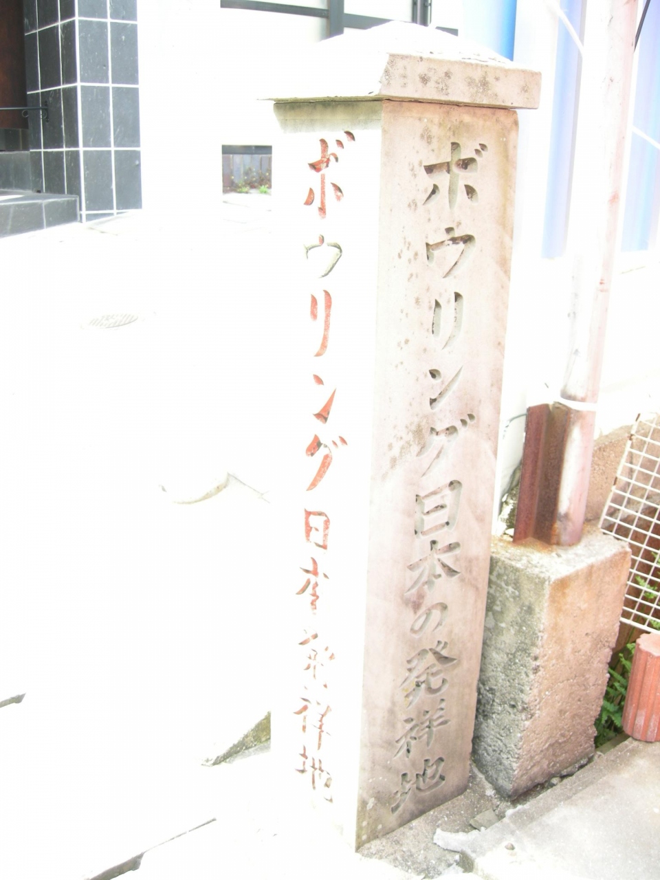 ここもそのひとつでしょうか、ボウリング発祥の地碑が道端にありました。