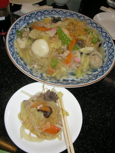 ほどなく、具材が豪華めなものが運ばれてきました。とろみの部分がたくさんかかっていたので皿うどんの麺のパリパリしたところはなく、これが本場のせいなのか特製のせいなのかは不明。w