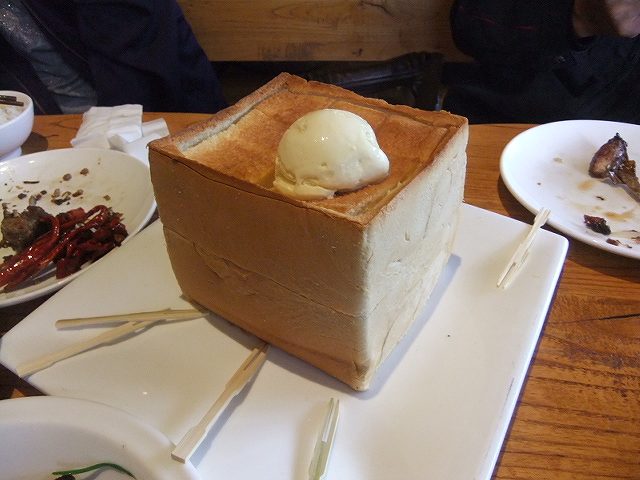 2人でよりも人数が多いほうが種類を色々頼める。若い男の子のテーブルに食パンの四角いままがある。めずらしいから同じものを注文してもらう。今はやってるのだとか。アイスクリームを乗せてあるから解けた所のパンをつまんで食べる。ちょっと甘すぎるアイスクリームです。- 旅行時期