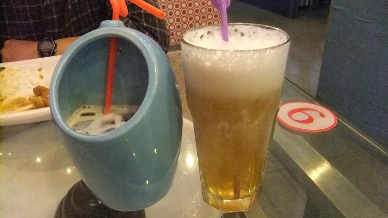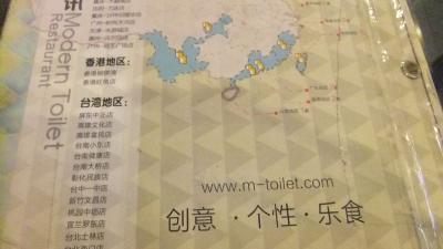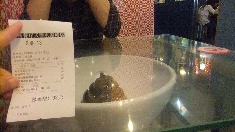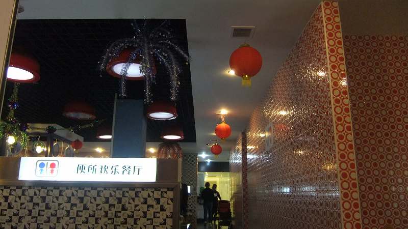 天津市紅橋区地下鉄1号線西北角駅A口すぐの水遊城3階。椅子は洋式便器。頼んだ料理の食器が洗面所の雰囲気。コップが小便器。他のテーブルに運ばれたアイスクリームは容器が和式便器だった。