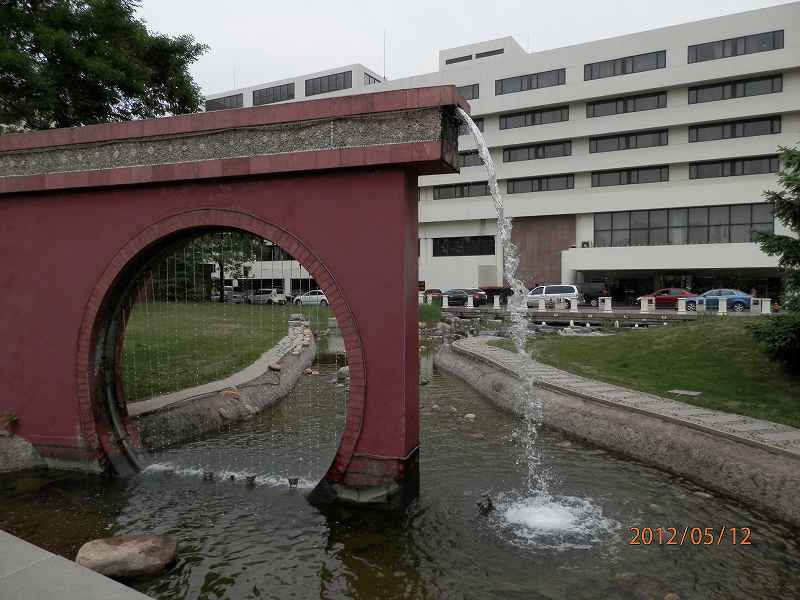 大通りからホテルの建物まで距離がある。それだけ敷地内の緑が楽しめる。紫金山路をはさんで津河があり、沿河路は遊歩道になっている。津河が「ある」というのは流れていないから。ロビーの吹き抜けに宿泊室が面しているから開放的。雰囲気が良い。