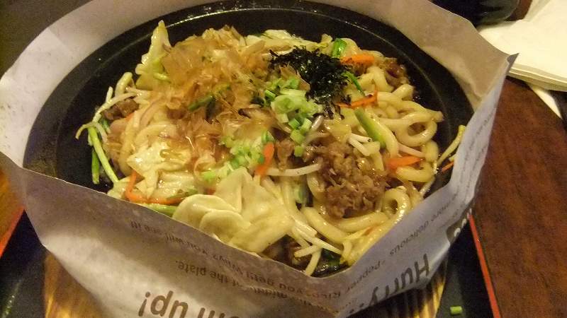2回目の利用は焼きうどんを注文。なんか大げさな紙が巻いてある。厚い鉄板から油が飛ばないようにという配慮なんでしょうか。初体験。テーブルの間隔が狭いから気をつけないと。