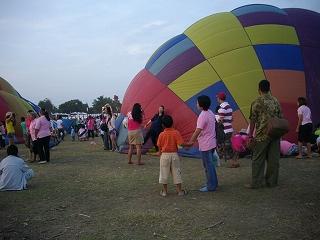 ポスターには祭りの日取りと時間が書いてある。だけどそれはバルーンが飛ぶ時間じゃない。初日飛び始めるのは15時から16時までだったらしい。着いたのが16時過ぎ。もう終りの飛び去るほんの少し勇士を拝んだ。ちょっとでも見れたから良かった。しばらく足を休ませる。祭りの様子を見ていたら薄暗くなってから動きがある。バルーンを広げて膨らませるところから上がるまで見ることが出来た。満足。