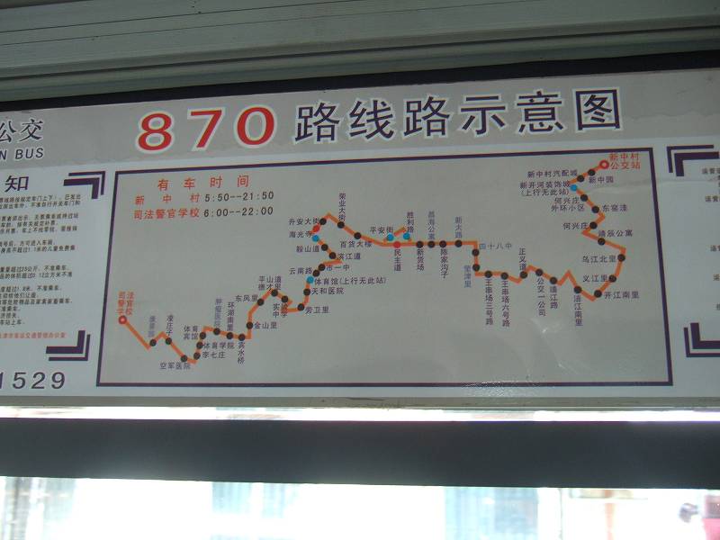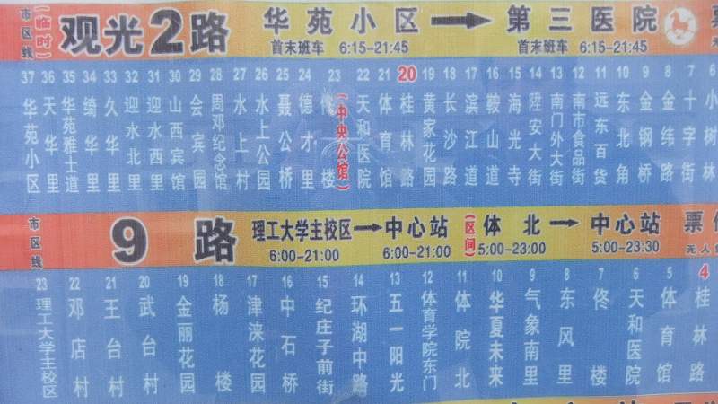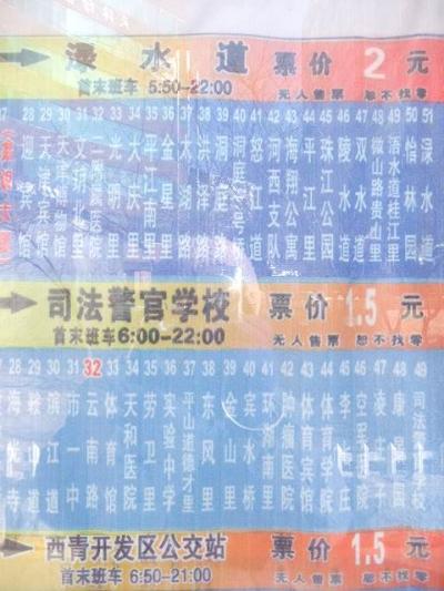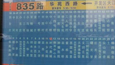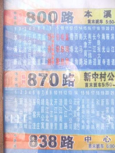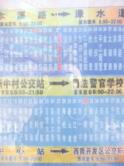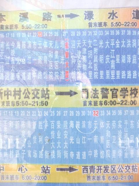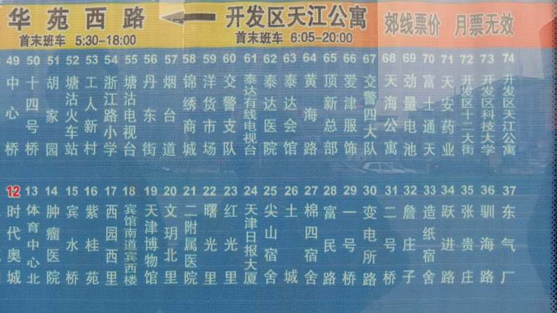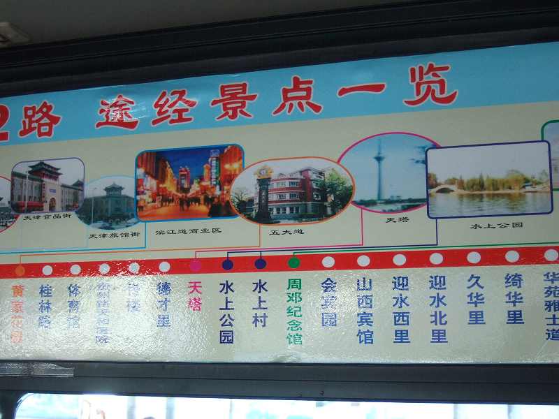 アパート前のバス停から2番バスに乗って天塔まで出掛ける。バス停には停車駅が表記してある。始発と最終の時間が記入されているが時刻表は無い。料金は均一。1.5元とある。しっかり小銭でお釣り無しで準備しておく。余分に出してもお釣りは貰えないから。