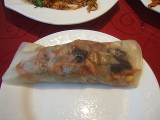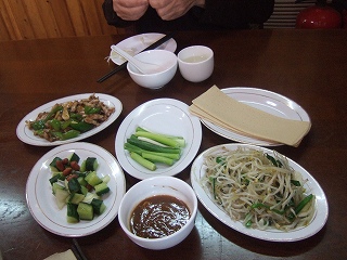 春巻きの皮状の白いものが分厚くて2枚重なってるからどうしたものかと眺めていたら。2枚重ねてその中に具を乗せて巻いて食べるんだと言われた。でもやっぱり皮を薄くして何回も食べた方がいいね。味は大連、旅順のツアーで連れて行かれた中で1番良いとおもった。