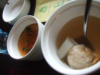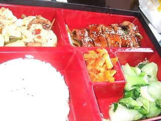 メニューに写真のある弁当を2種類注文。ボリューム満天。白飯、たくあん、辛くないマーボー豆腐、チンゲンサイの炒め物が共通。スープ。具の無い茶碗蒸し風も付いてくる。銀杏の苦味が好きなんだけど入ってなかった。
