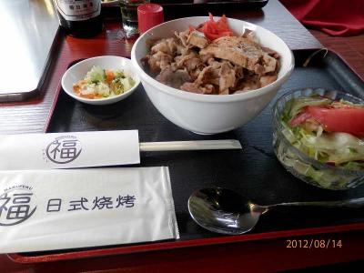 私が頼んだ牛丼。紅しょうがが乗っかっているのは嬉しい。でも汁が全く無い。ご飯に少しもかかっていない。ザンネンだ。白飯が美味しいのは嬉しい。女の子グループは焼肉のセットを注文して味噌汁は3杯は飲んでいた。- 旅行時期